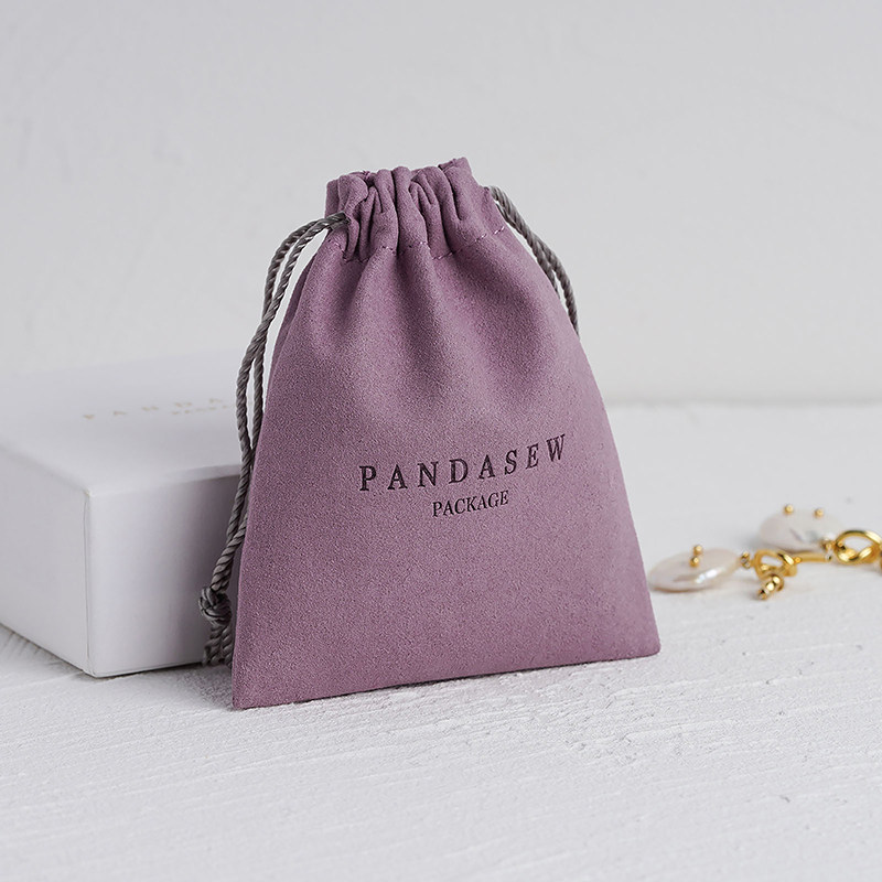 A compact microfiber drawstring jewelry pouch for necklaces and rings, featuring a soft suede-like texture and custom logo options for branded packaging.